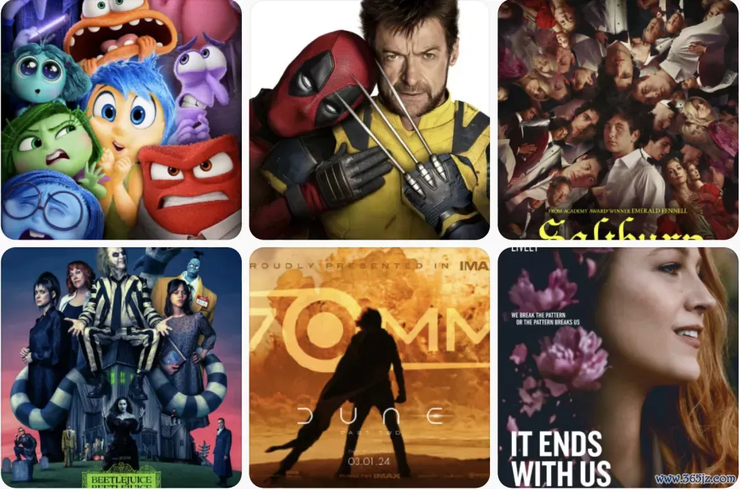 1. 《头脑特工队2》;2. 《死侍与金刚狼》;3. 《萨特本》;4. 《阴间大法师2》;5. 《沙丘2》;6. 《爱情,到此端正》;7. 《奥本海默》;8. 《功夫熊猫4》;9. 《异形:夺命舰》;10. 《销魂怯夫3》 ;