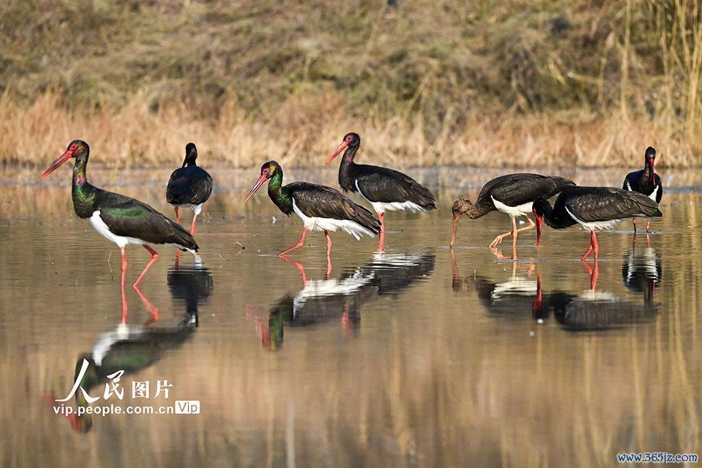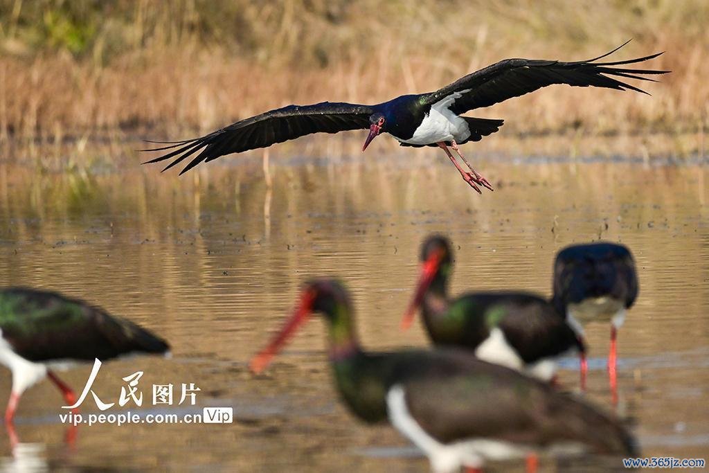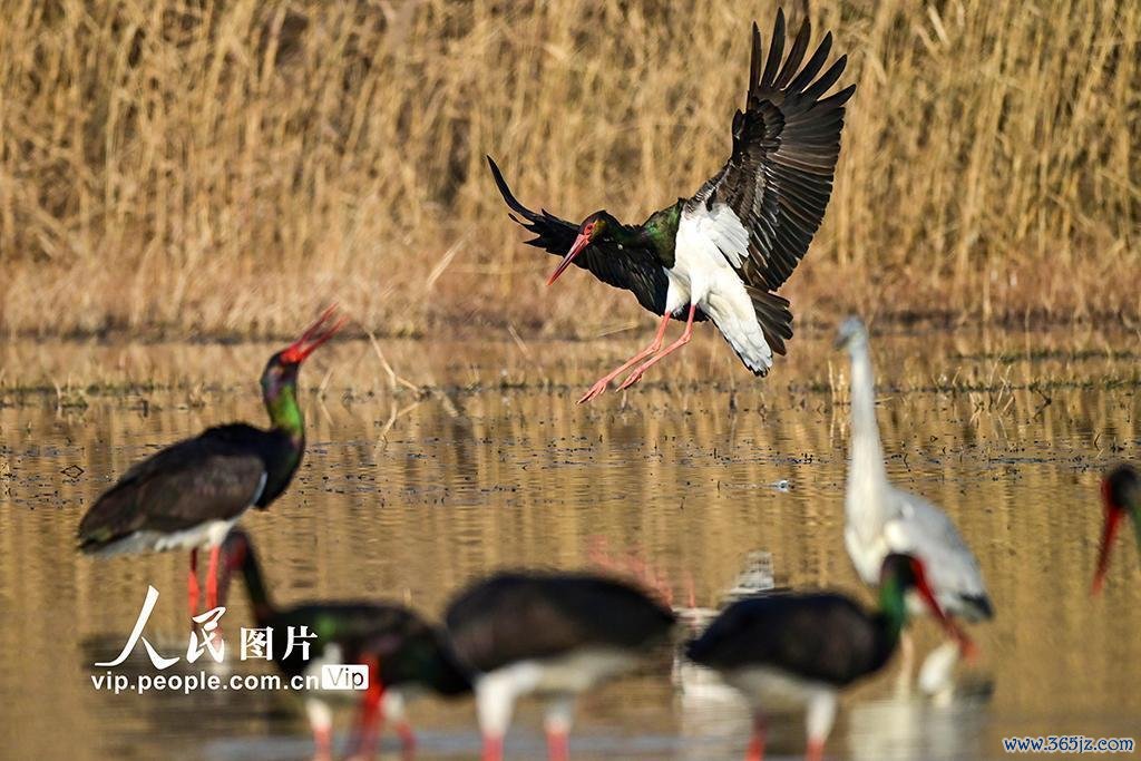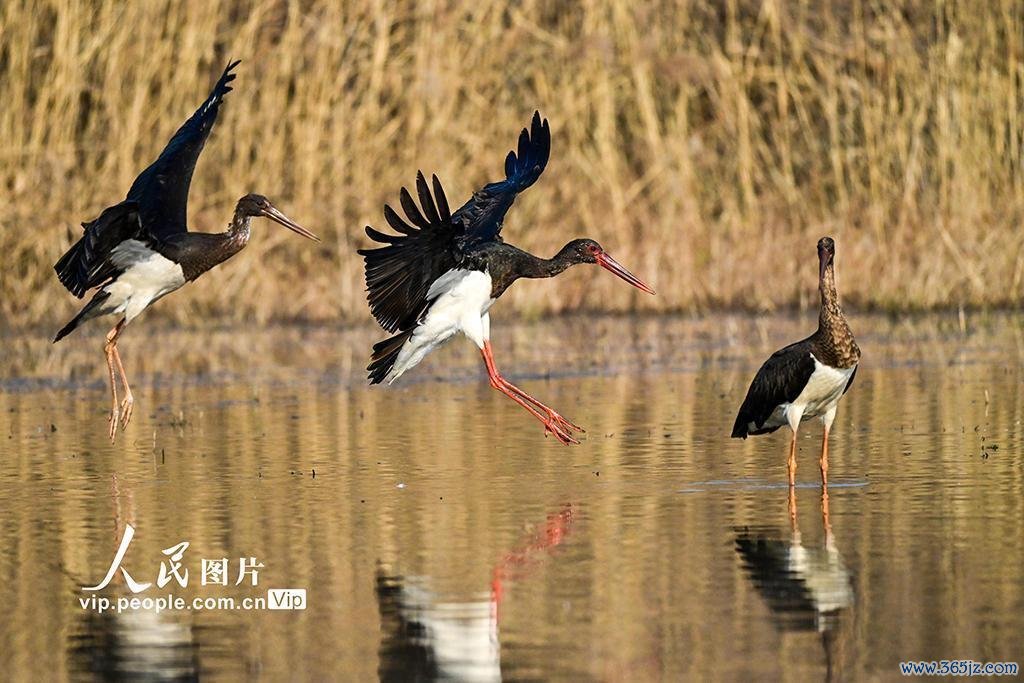 2024年12月17日,黑鹳在河南洛阳孟津黄河湿地觅食、嬉戏。