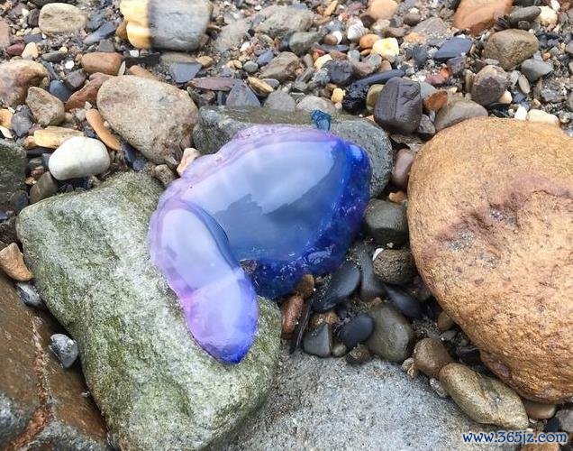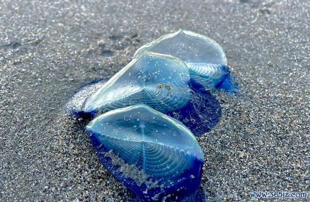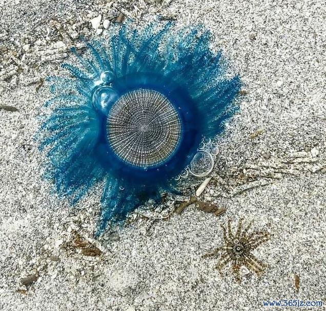 4、海滩上的“矿藏”。暴雨事后,逆风水母(Velella Vellela)/蓝帆水母被冲上岸。它们很好意思