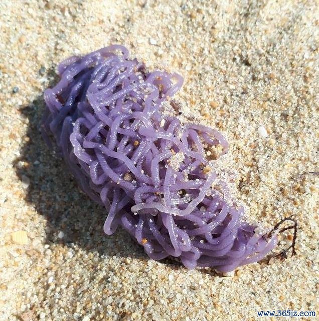 3、在海滩上发现的。发现它的东说念主说它是海藻,但它看起来有点像某种奇怪的动物或什么东西……我用棍子戳了一霎,有些部分就断了