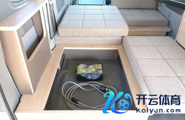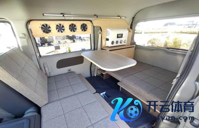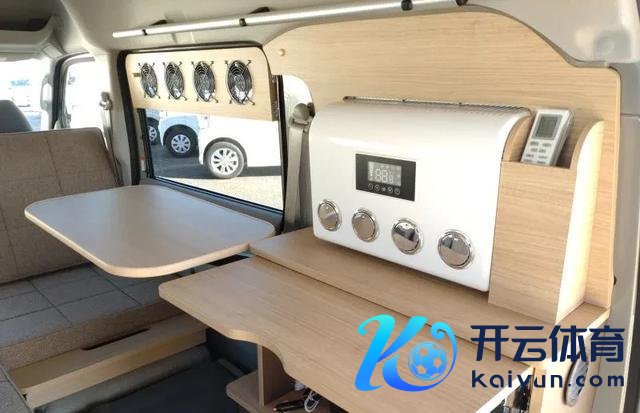 车尾后方并莫得提供厨房约略卫生间(空间太小,念念作念也作念不了),而是集成了一台底置变频空调(国内有同款)和储物柜,而且这里还可以增多一个折叠小餐桌,在后方区域也变成一个袖珍的休息区。