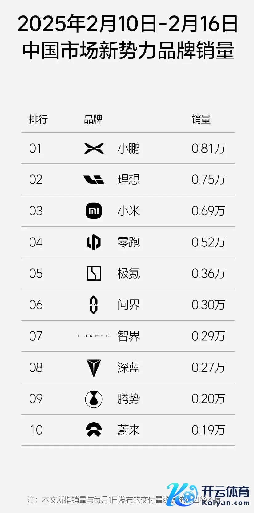 小鹏汽车则在2月第2周(2月10日-2月16日),夺得新势力榜冠军,周销量为0.81万辆。