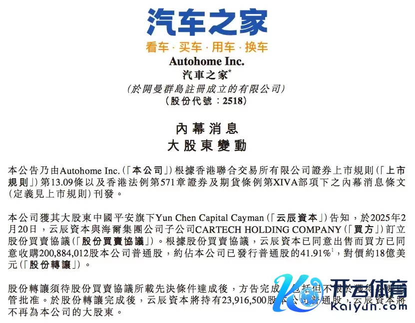 此外,海尔集团旗下Cartech Holding Company(卡泰驰控股)与中国祯祥旗下云辰成本达成契约,卡泰驰控股将以总价约18亿好意思元收购云辰成本抓有的汽车之家已刊行的200,884,012股广宽股股份。
