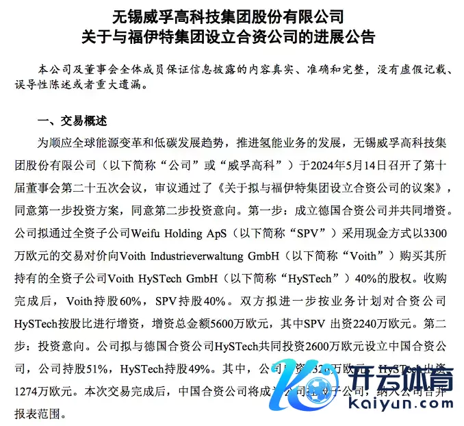 讯息面上,威孚高科通过了全资子公司Weifu Holding ApS(简称“SPV”)以3300万欧元收购福伊特集团全资子公司Voith HySTech GmbH(简称“Voith”)的40%股权,收购后Voith抓股60%,SPV抓股40%。两边还规画对合伙公司进行增资,总金额为5600万欧元,其中SPV出资2240万欧元。