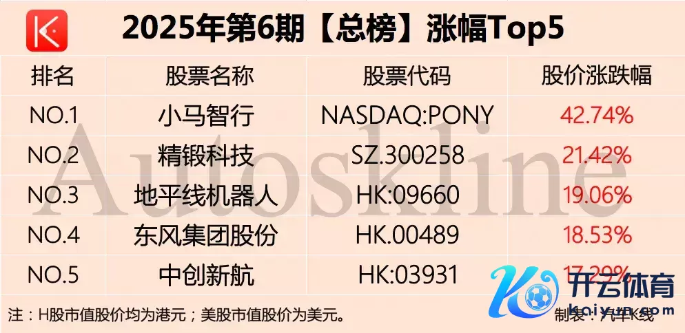 其中,涨幅逾越10%的个股有13只,而领涨总榜的小马智行以高达42.74%的涨幅一马领先;精锻科技则以21.42%的涨幅排在第2位;地平线机器东说念主、东风集团股份和中改进航则分散以19.06%、18.53%和17.29%的周涨幅排在TOP5。