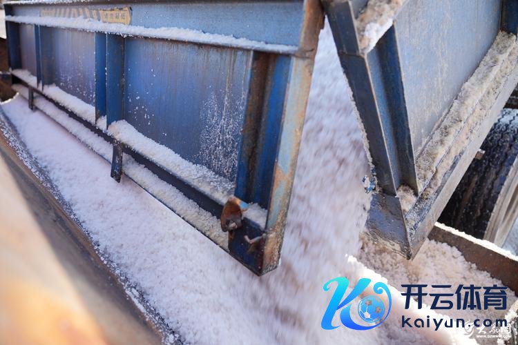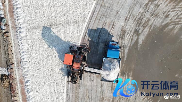 4日上昼,记者刚踏入东风盐场区域内,不辽远就响起了机械的轰鸣声。通过航拍看到,一辆扒盐机在盐池子里无间功课,几名盐工在结晶池边际每隔一段时辰就将盐往内堆积,捞出的盐通过顶部管谈装进转运车的车斗里,在四台转运车抵制歇地运送下,一车车的大颗粒盐被运往场区边际,通过传送带一批批地垒积成大盐垛。
