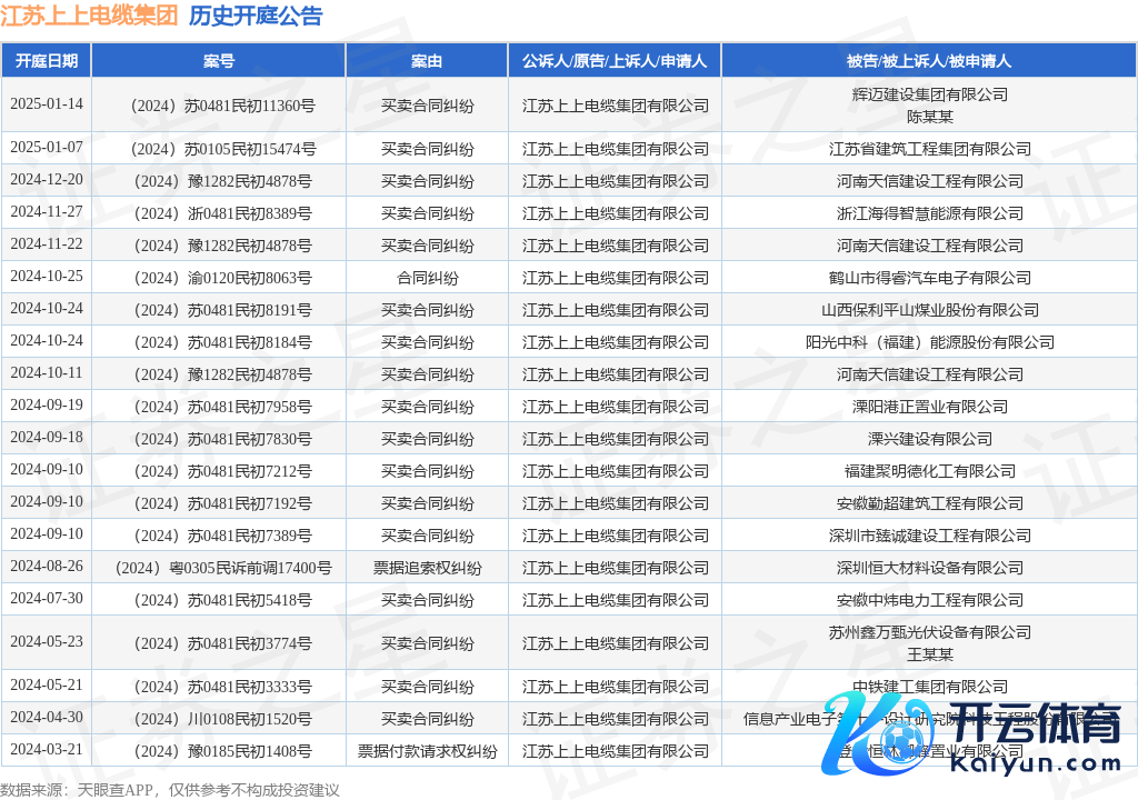 本站音书,说明天眼查APP显现,近日公布了一则江苏上上电缆集团有限公司动作原告/上诉东谈主的开庭公告,详备实践如下: