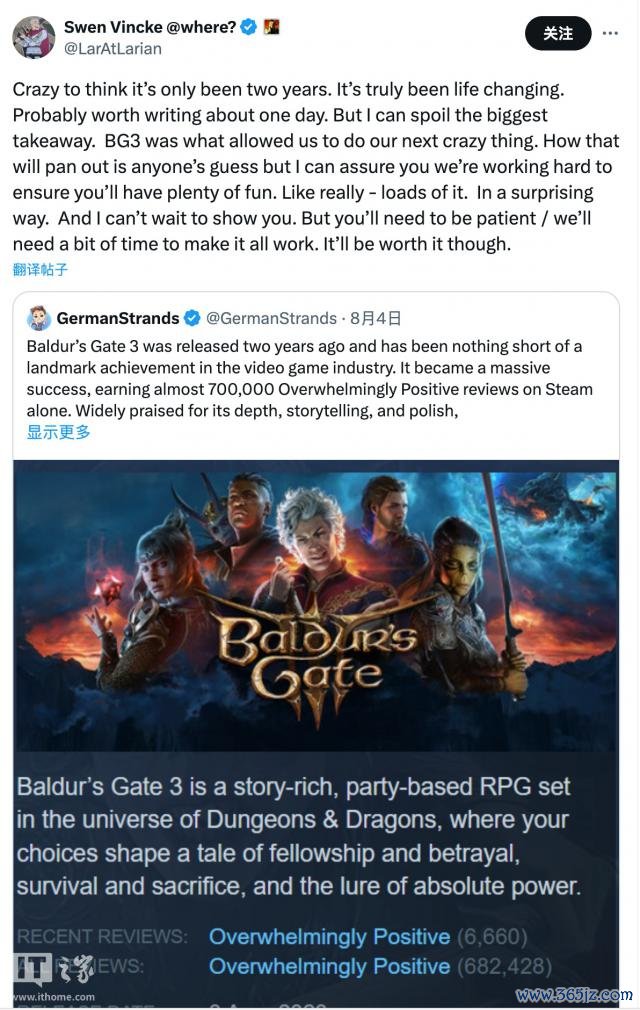 "真不敢确信才当年两年!这段资格透顶更正了我的东说念主生,可能改日值得写本书来纪录。不外,我不错先涌现最贫乏的少量:《博德之门 3》为咱们带来了契机,去作念下一个猖獗的尝试。效果会若何,咫尺谁王人说不准。但我能保证,咱们正任重道远地缔造它,一定会让你们玩得尽兴 —— 况且是个大惊喜。我确实很思尽早公开它,但还需要环球耐性少量。咱们还得花些技艺把一切准备恰当。不外,确信我,恭候是值得的。"