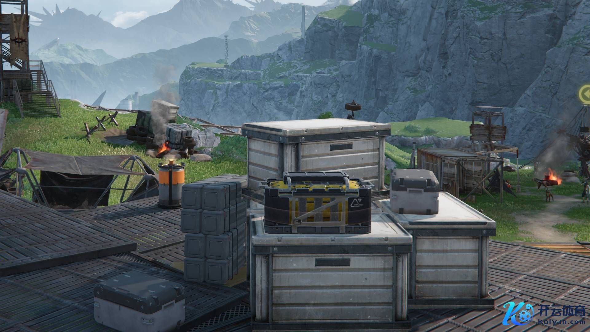 2位于营地内,**一些板条箱上方**。