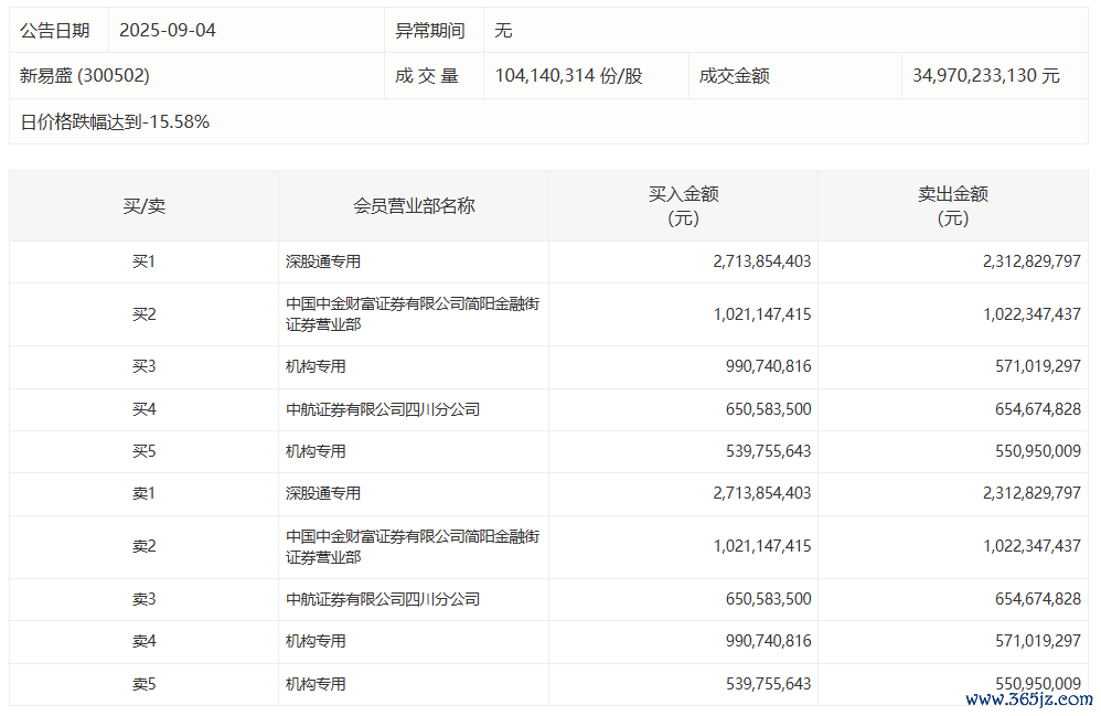 新易盛当天跌15.58% 1家机构专用席位净买入4.20亿元