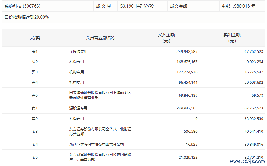 锦浪科技当天20cm涨停,3家机构专用席位净买入3.36亿元