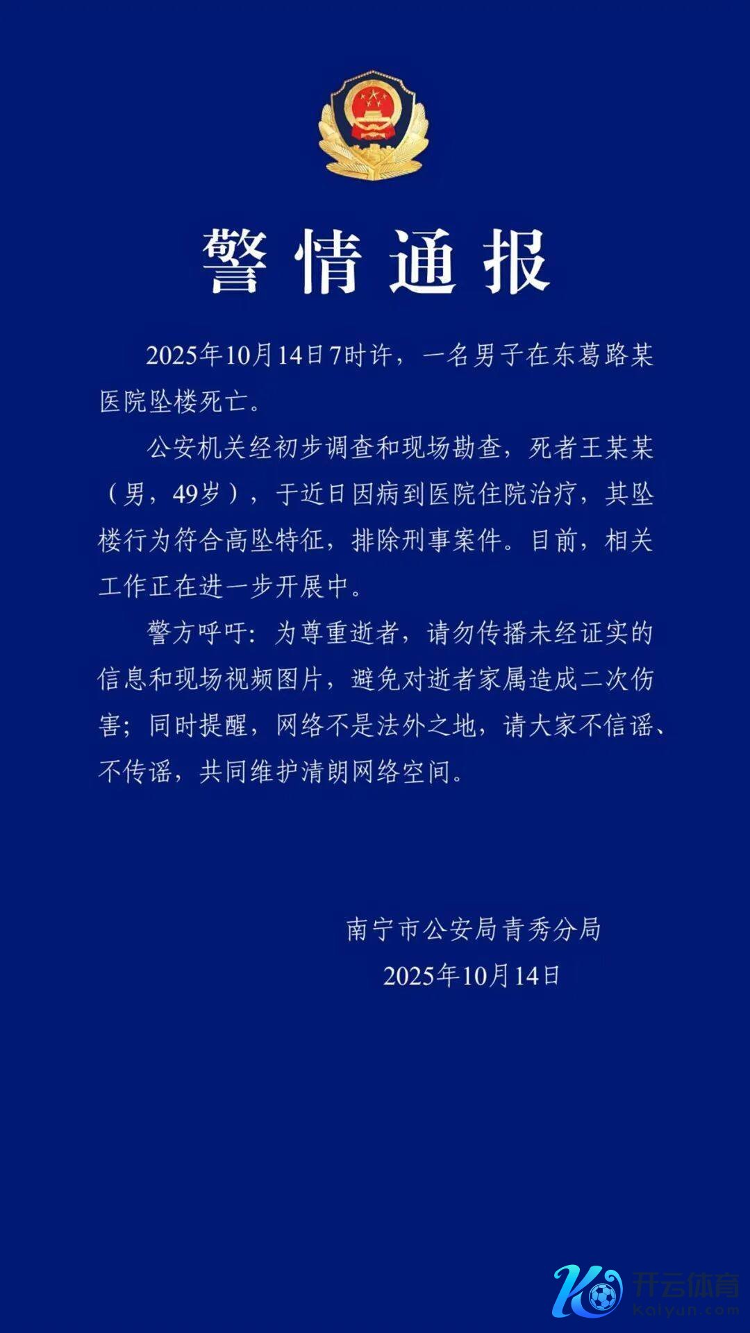 南宁市公安局青秀分局通报,10月14日7时许,又名须眉在东葛路某病院坠楼物化。